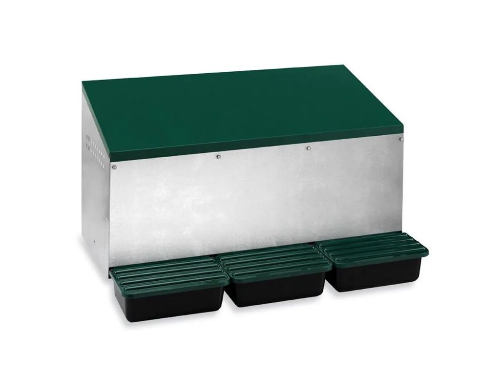 Konstrukce hnízda je pozink, košíky jsou plastové. Hnízdo nemá přední stěnu a je tedy vhodné ho připevnit ke kurníku zvenku.